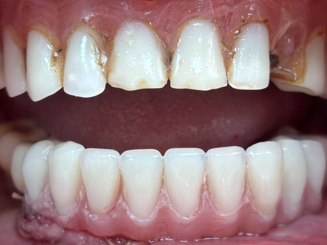 הפציינטית מ', בת 75, פנתה עם תלונות על כאבים וניידות של שיני הלסת התחתונה מתחת לגשר ממתכת־חרסינה. ב־CT של הלסת התחתונה נצפתה אטרופיה של רקמת העצם באזור שורשי השיניים.